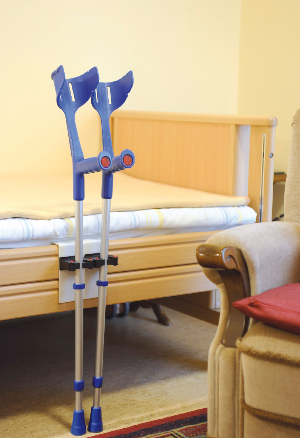 Sostegno pratico per stampelle applicabile, con gancio, alla base del letto. Non necessita di montaggio a vite.