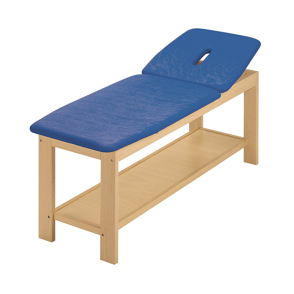 Lettino da esami e trattamenti in legno massello di faggio a due sezioni e ad altezza fissa cm 78. Le sezioni hanno larghezza standard cm 68, e quella di testata è regolabile in positivo fino a 45° con un sistema manuale. Questo modello prevede una sezione di testata con foro naso-bocca, con il tappo di serie. l lettino è dotato di un utile sottopiano.