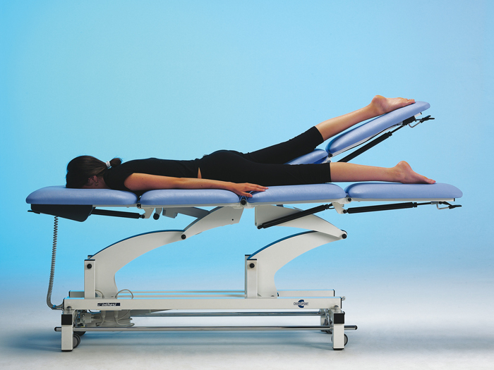 Il lettino ha sei sezioni mobili. La sezione del tronco è regolabile elettricamente con la pulsantiera fissa; le altre sezioni sono regolabili con sistema servoassistito da una o più molle a gas. La regolazione motorizzata della sezione del tronco consente di annullare completamente lo sforzo dell’operatore nelle regolazioni della sezione con il paziente in trattamento.