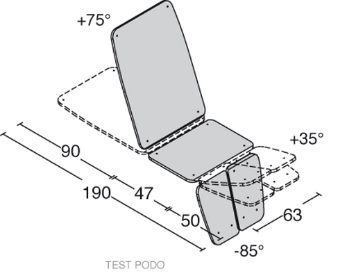 Lettino polivalente per diagnosi e trattamenti indicato in podologia regolabile in altezza idraulicamente o elettricamente mediante pedaliera a bassa tensione (24V). Lettino a quattro sezioni: schienale e poggiagambe dotate di sistema di regolazione servoassistito da molle a gas. In particolare le due sezioni poggiagambe sono regolabili separatamente. Il lettino è predisposto per essere integrato da un'ampia gamma di accessori.