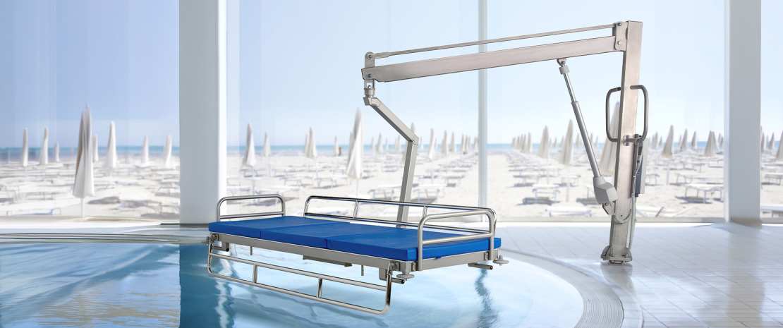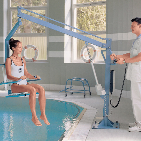 Quando la persona non è in grado di mantenere una posizione seduta o di preferenza all'operatore, il sistema di sollevamento per piscine permette di trasferire la persona in acqua con un'apposita imbracatura a passanti.