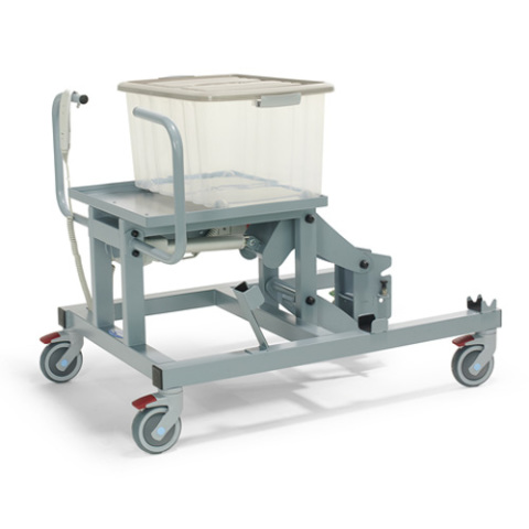 Il braccio di sollevamento è assistito da un attuatore elettrico alimentato da una batteria ricaricabile a 24 V. Il caricabatteria è fornito di serie. La regolazione elettrica dell'altezza avviene con un comando a pulsante, e il sollevatore è dotato di un meccanismo di discesa di emergenza.