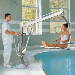 Quando la persona non è in grado di mantenere una posizione seduta o di preferenza all'operatore, il sistema di sollevamento per piscine permette di trasferire la persona in acqua con un'apposita imbracatura a passanti.