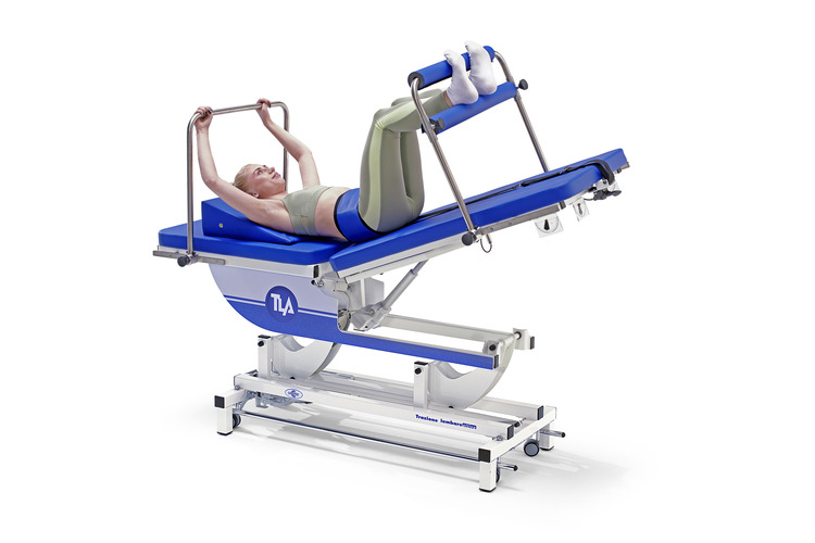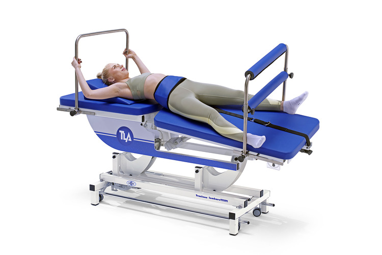 Il lettino TLA è uno speciale lettino ad uso fisioterapico che è diviso trasversalmente. La parte caudale del lettino può essere inclinata lentamente verso l’alto o verso il basso e ruotata verso destra o verso sinistra attraverso un servomeccanismo elettrico, per posizionare o mobilizzare tridimensionalmente la colonna lombosacrale del paziente.