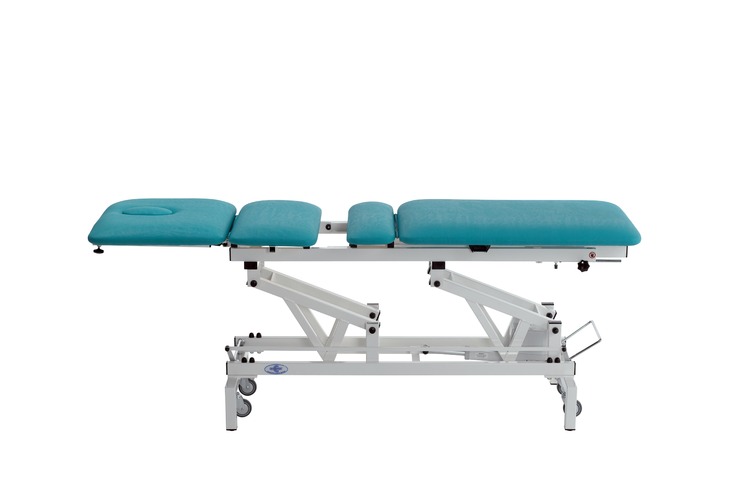 Lettino da visita, manipolazioni e trazioni a quattro sezioni, regolazione in altezza idraulica. È possibile eseguire trazioni lombari e cervicali.